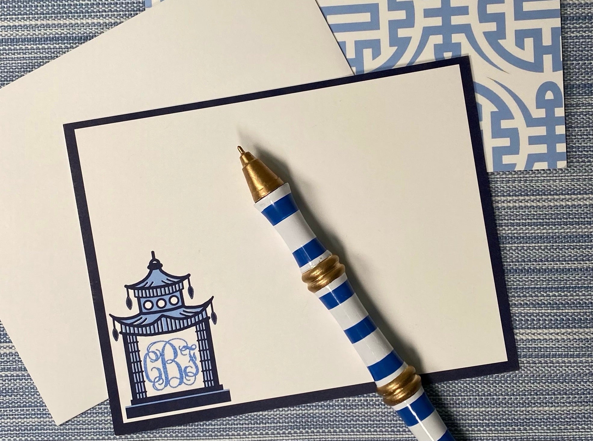 Write your notes in style with our brand-new double-sided flat notecards! This darling piece of stationery features your monogram or initial encased in our blue and white chinoiserie pagoda on the front. The back features an all-over china blue "happiness" pattern.