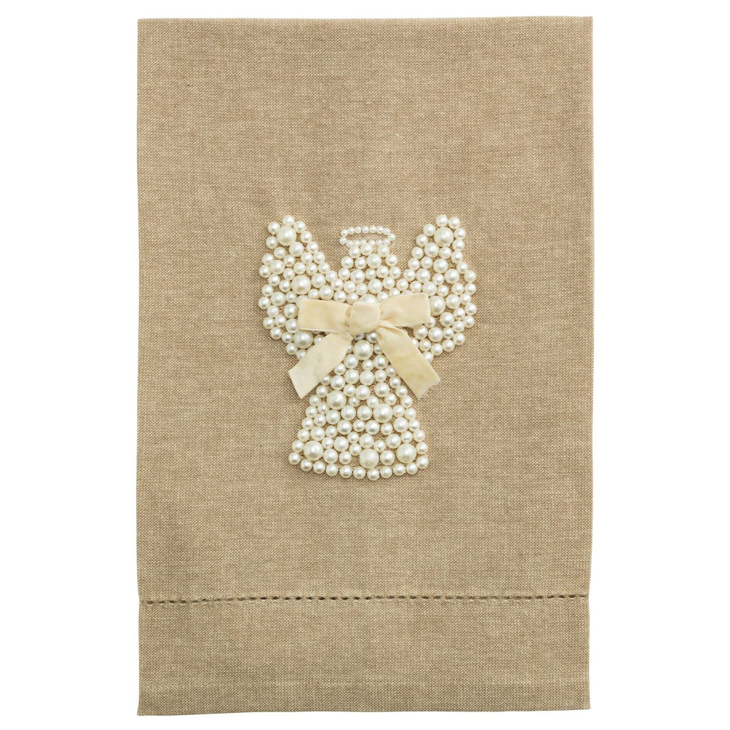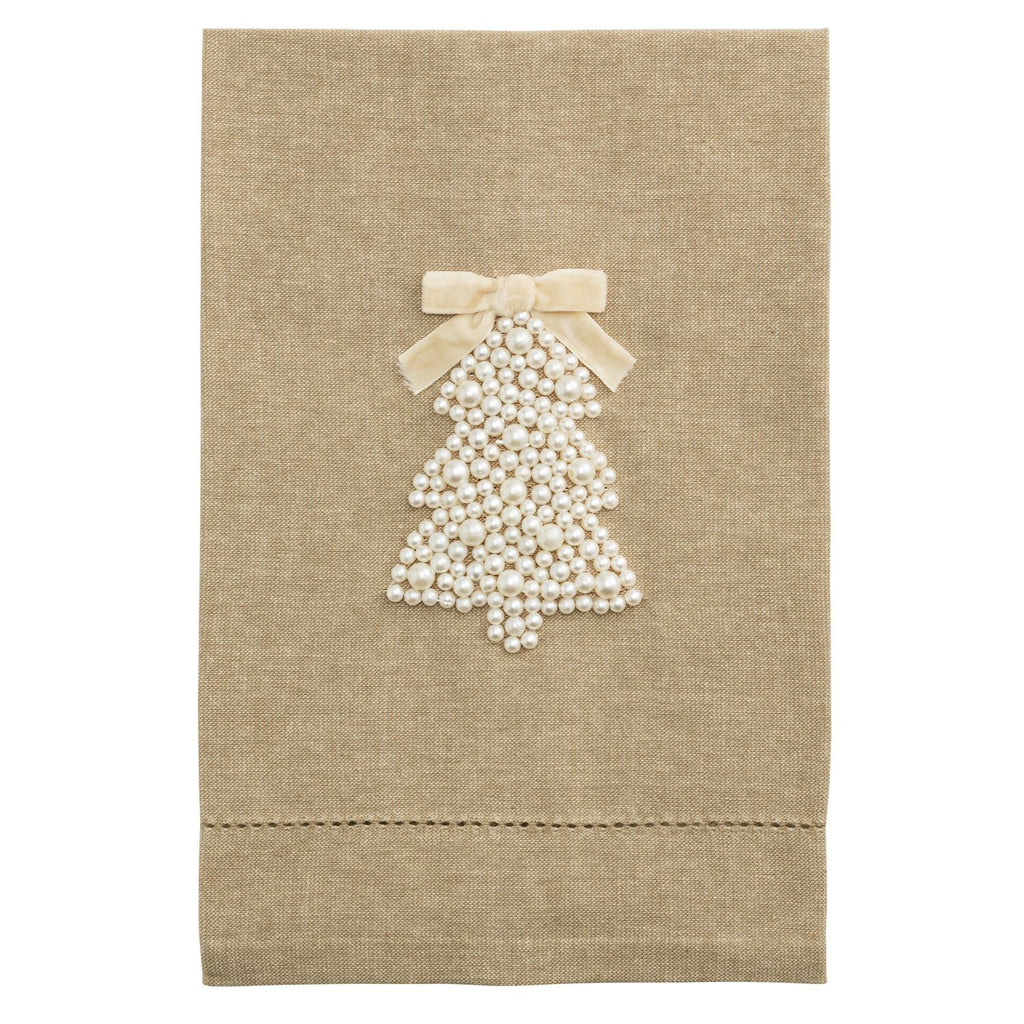 Our White Pearl Christmas hand towels are chambray, featuring pearl bead appliqué with velvet bow and hem stitching.