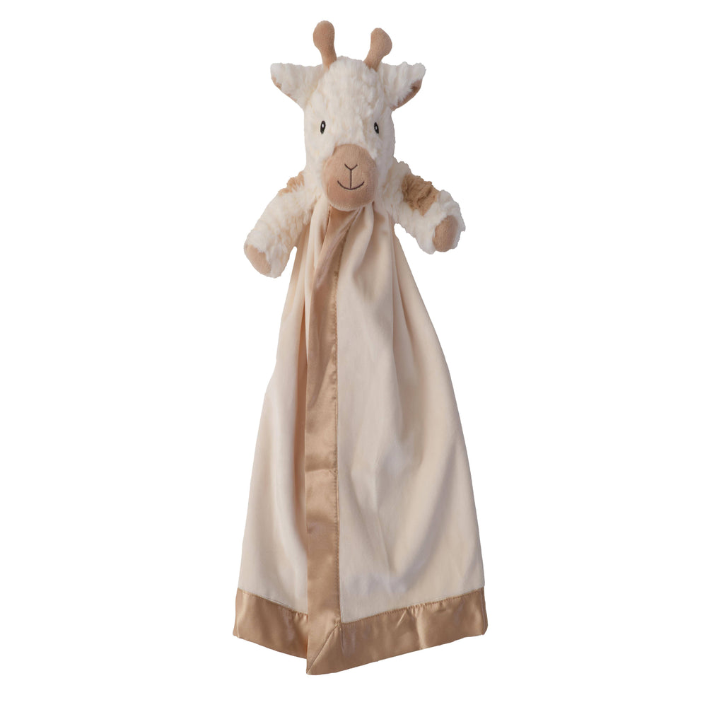 Ultra soft snuggler blanket with satin lining, combined with a cute plush stuffed animal giraffe head and arms, machine washable. At 15" tall, this is just right for infants or babies to cuddle and then become a toddler's treasured lovey. Blanky is made with luxuriously soft off velour and is lined and trimmed in silky satin, the plush unicorn features embroidered safety eyes and a satin bow
