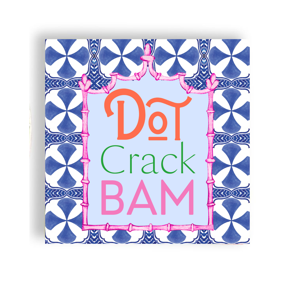 Bring a pop of color and playful style to your shop with our “Dot Crack Bam” cocktail napkins. Featuring a bold blue-and-white tile pattern, bright bamboo frame, and cheerful typography, these napkins are a must-have for Mahjong players and game night hosts alike.