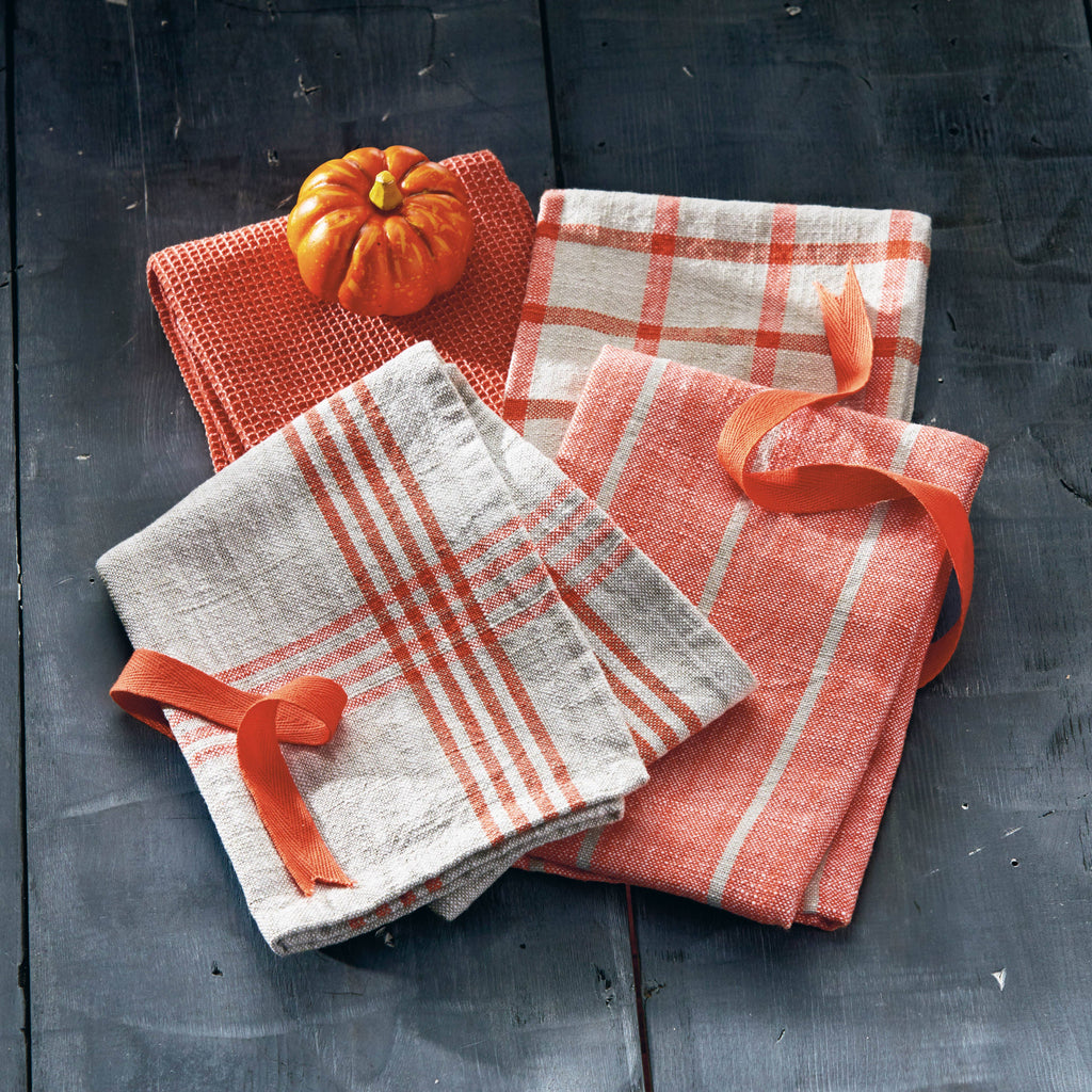 bring a burst of sunshine to your kitchen with the canyon woven dishtowel in orange. this set of four dishtowels is crafted from yarn-dyed cotton and features a unique combination of slub and waffle weaves for added visual interest and a touch of vibrancy. enzyme washed for extra softness and absorbency, these dishtowels also include convenient hang loops.