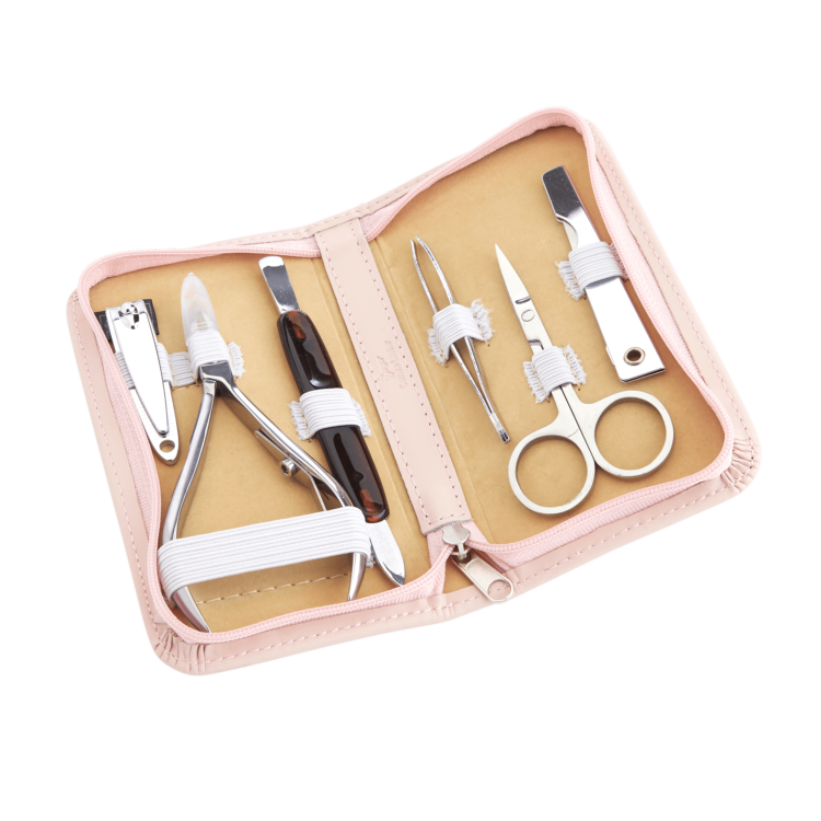 A handcrafted leather case surrounds this beautiful 6 piece grooming kit, perfect for your purse or overnight bag. Includes finger nail clipper, nipper, cuticle pusher, folding nail file, tweezers and cuticle scissors
